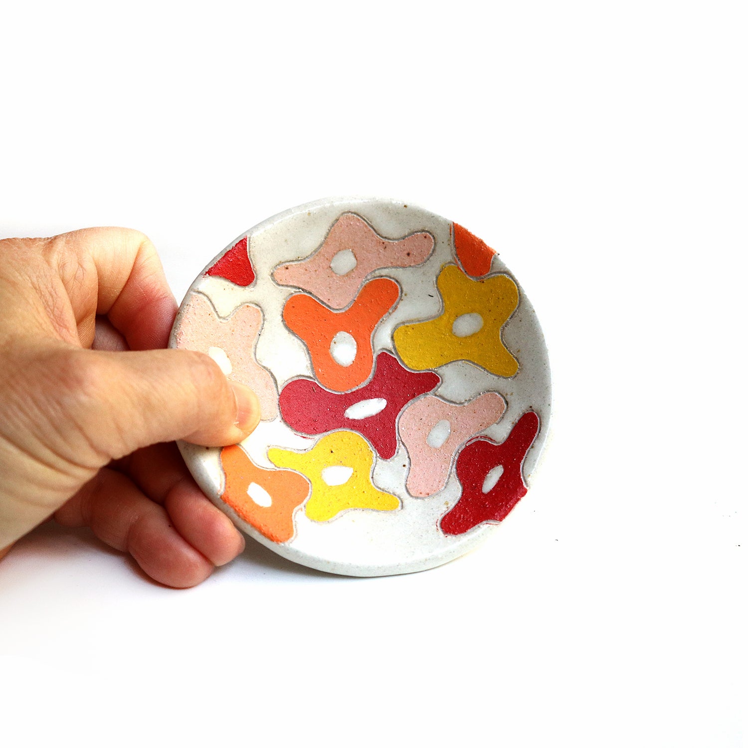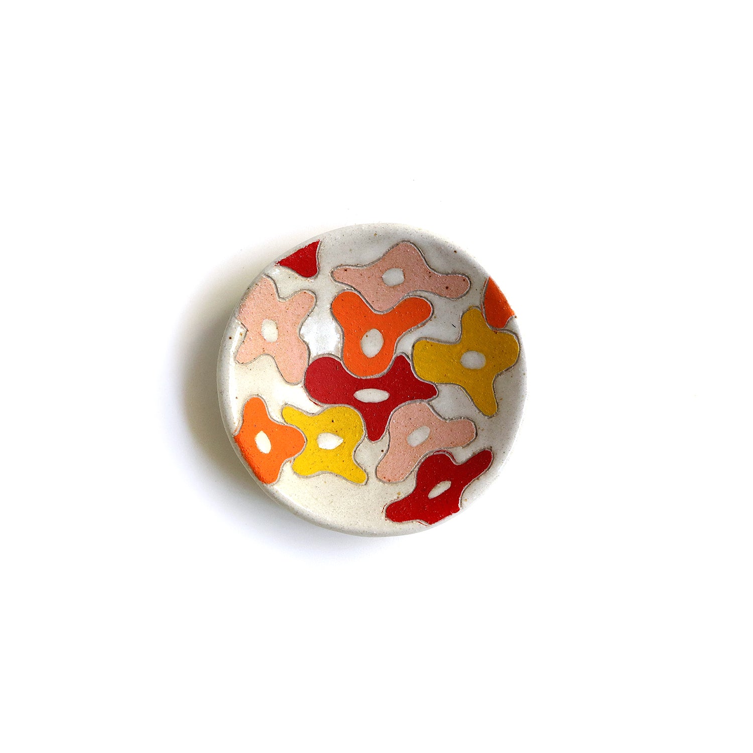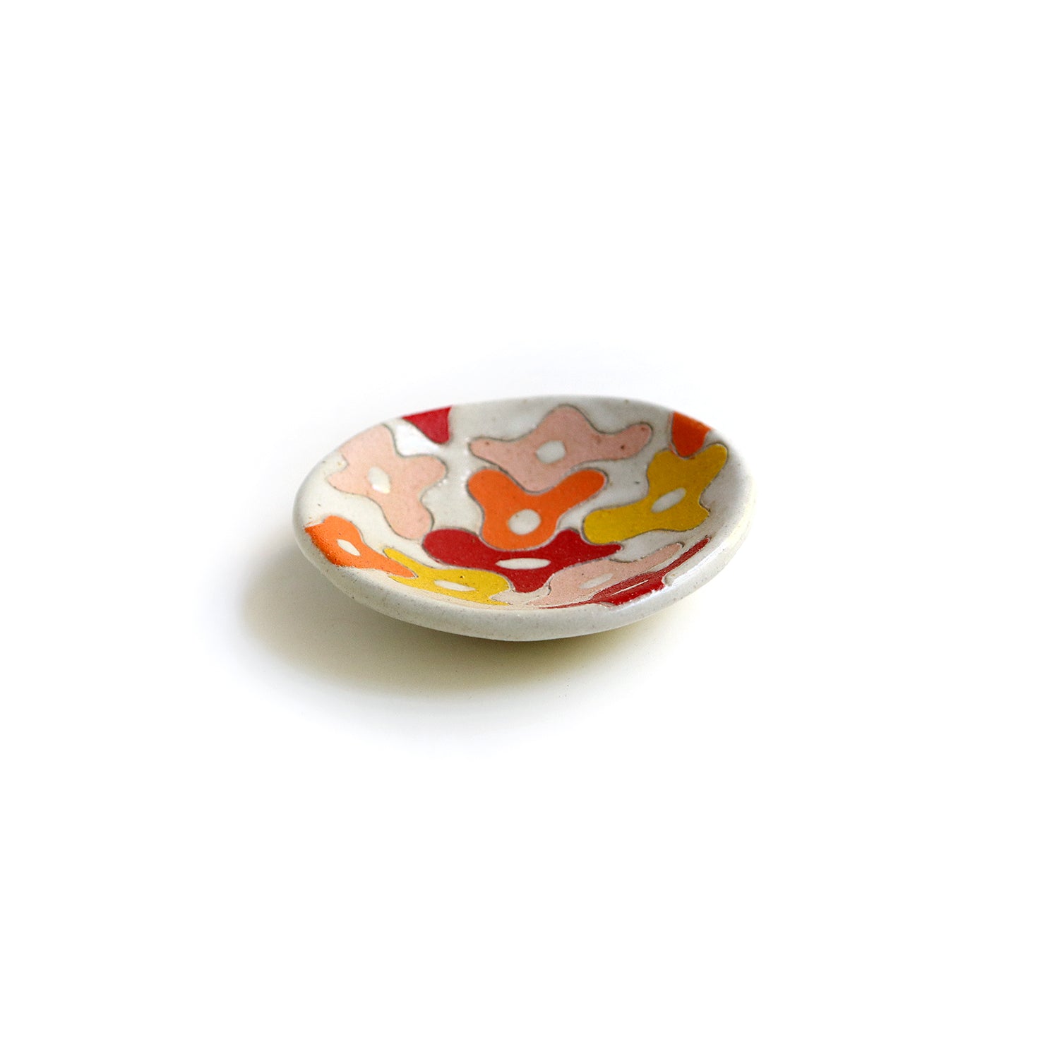 Ceramic dish. Glossy white glaze. Hand painted with under glazes. Measures approx. 1" tall and 4" wide.