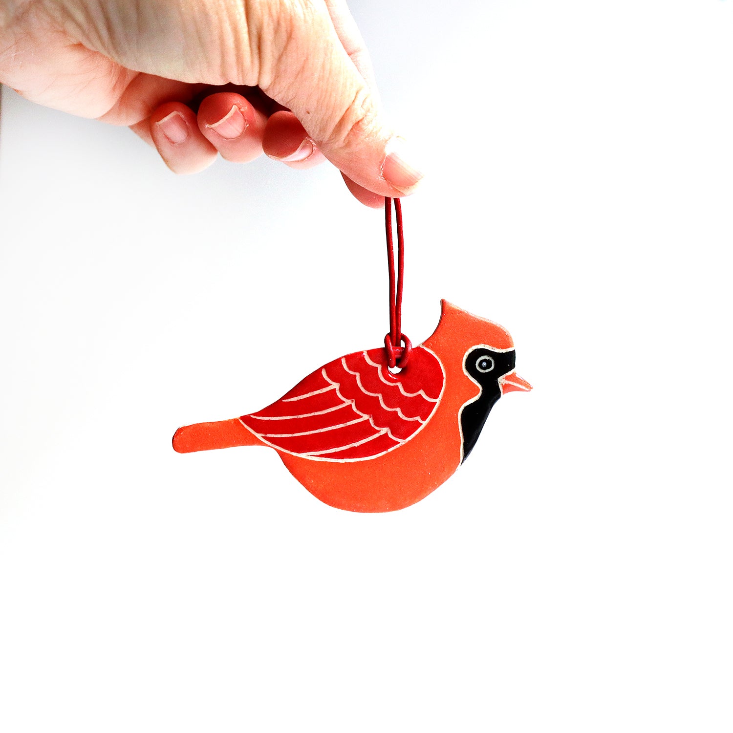 Hand painted with under glazes and carved. Glossy clear glaze on face and wing. Leather strap. Measures approx. 2.5" tall (4.25" incl. strap) and 4" wide.