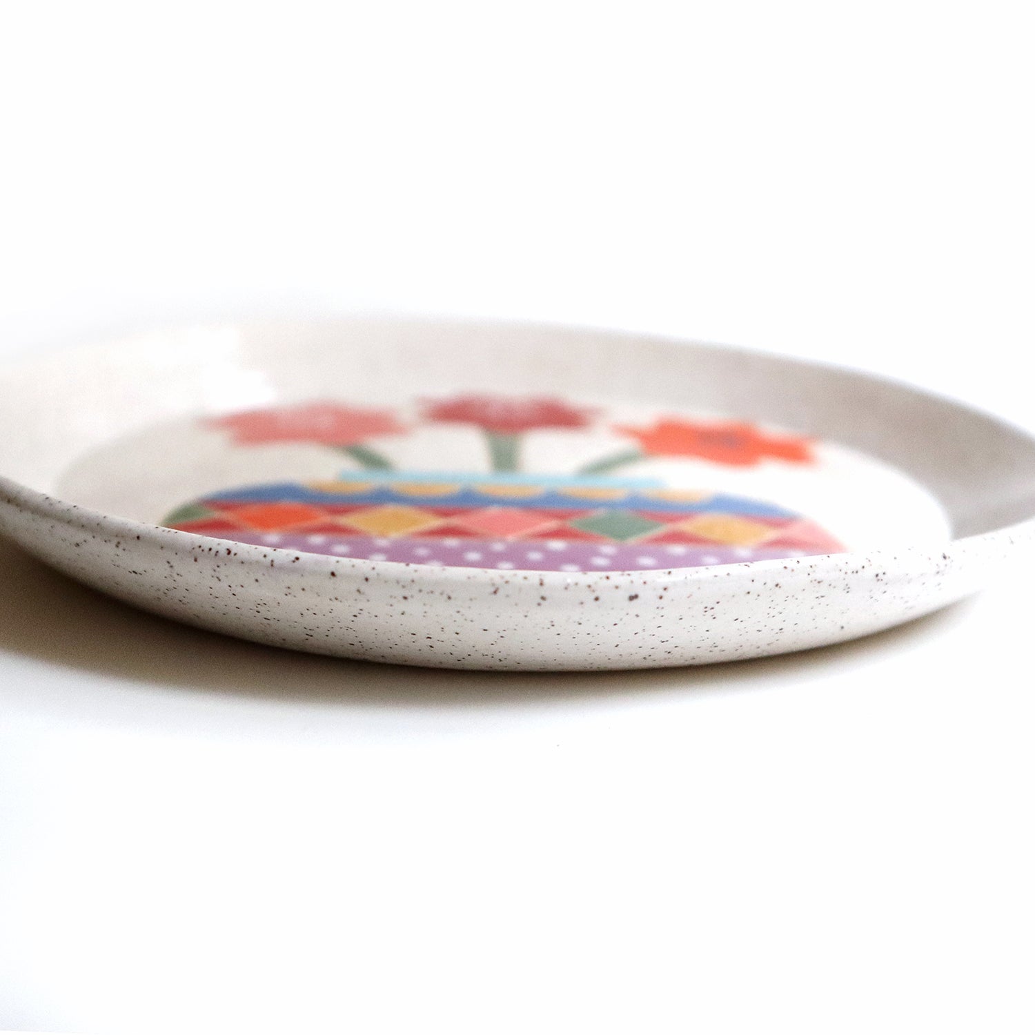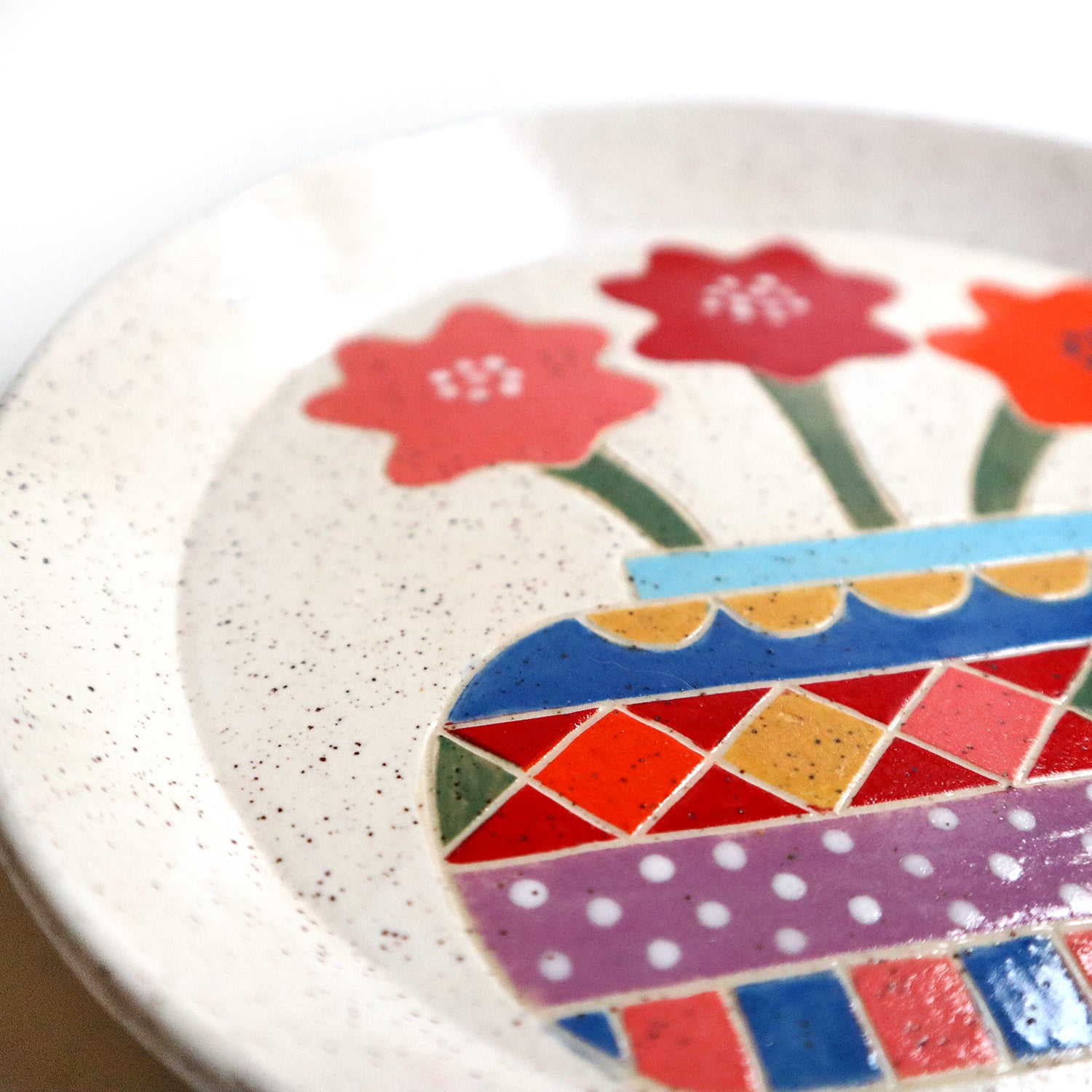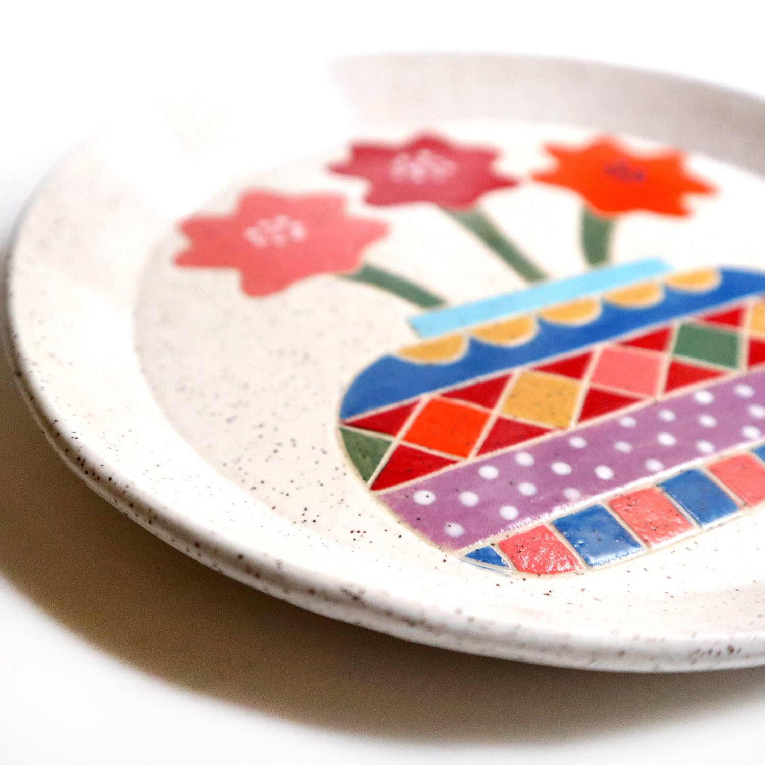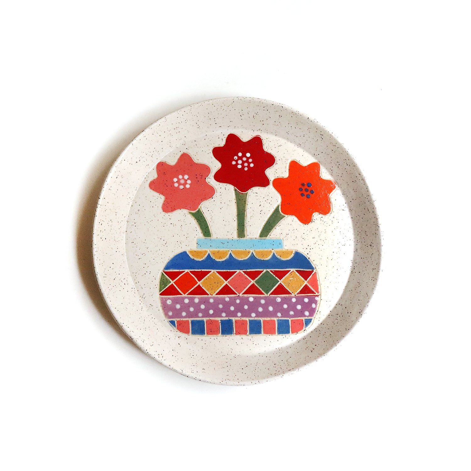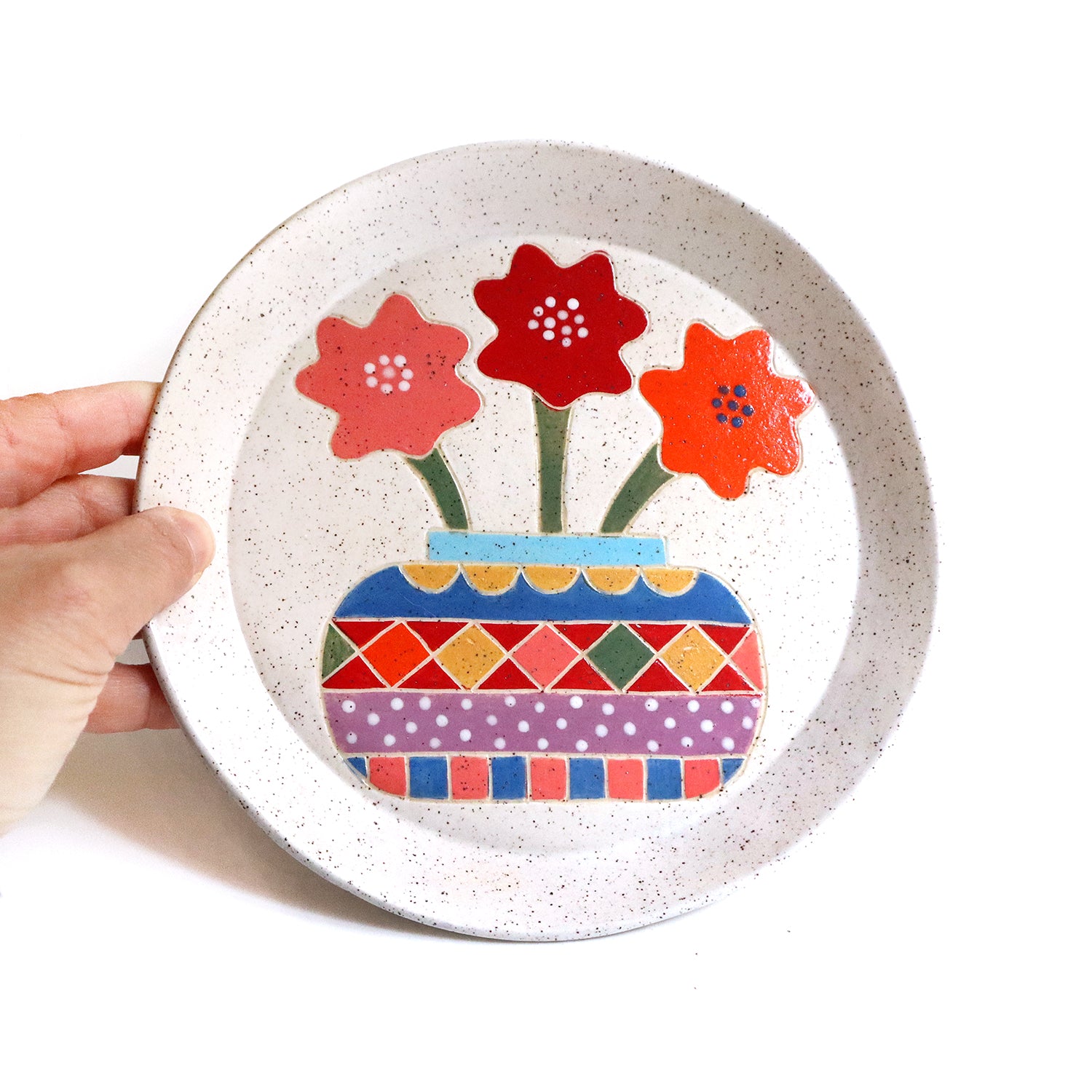 Ceramic plate measures approximately 7" and .75" tall. Hand painted with under glazes and carved. Glossy white glaze. Hand washing recommended but can be put in the dishwasher. Microwave safe.