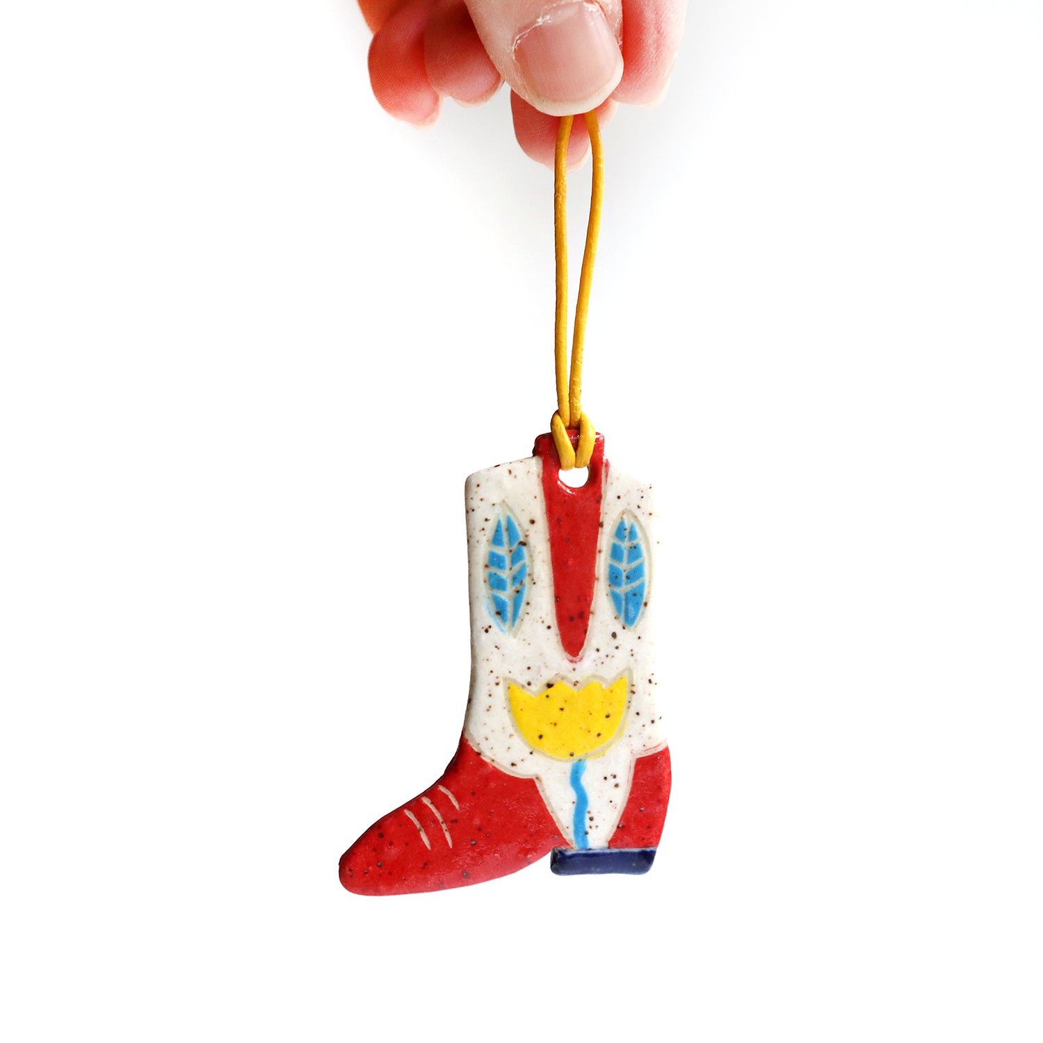 Hand painted with under glazes and carved. Leather strap. Measures approx. 2.5" tall (5" incl. strap) and 1.75" wide.