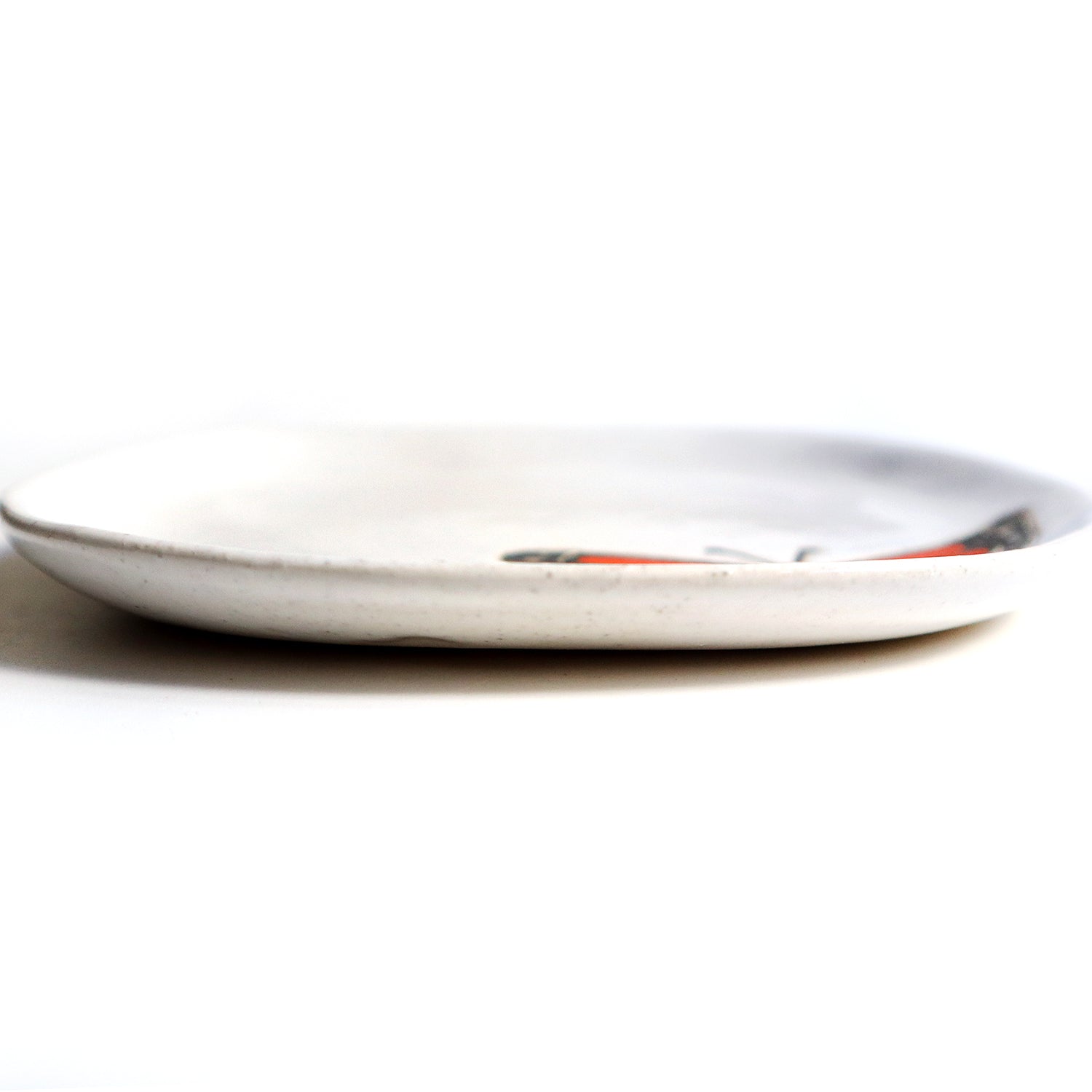 Stoneware plate measures approximately 6" x 6" and .5" tall. Hand painted with under glazes and carved. Glossy white glaze. Hand washing recommended. Microwave safe.