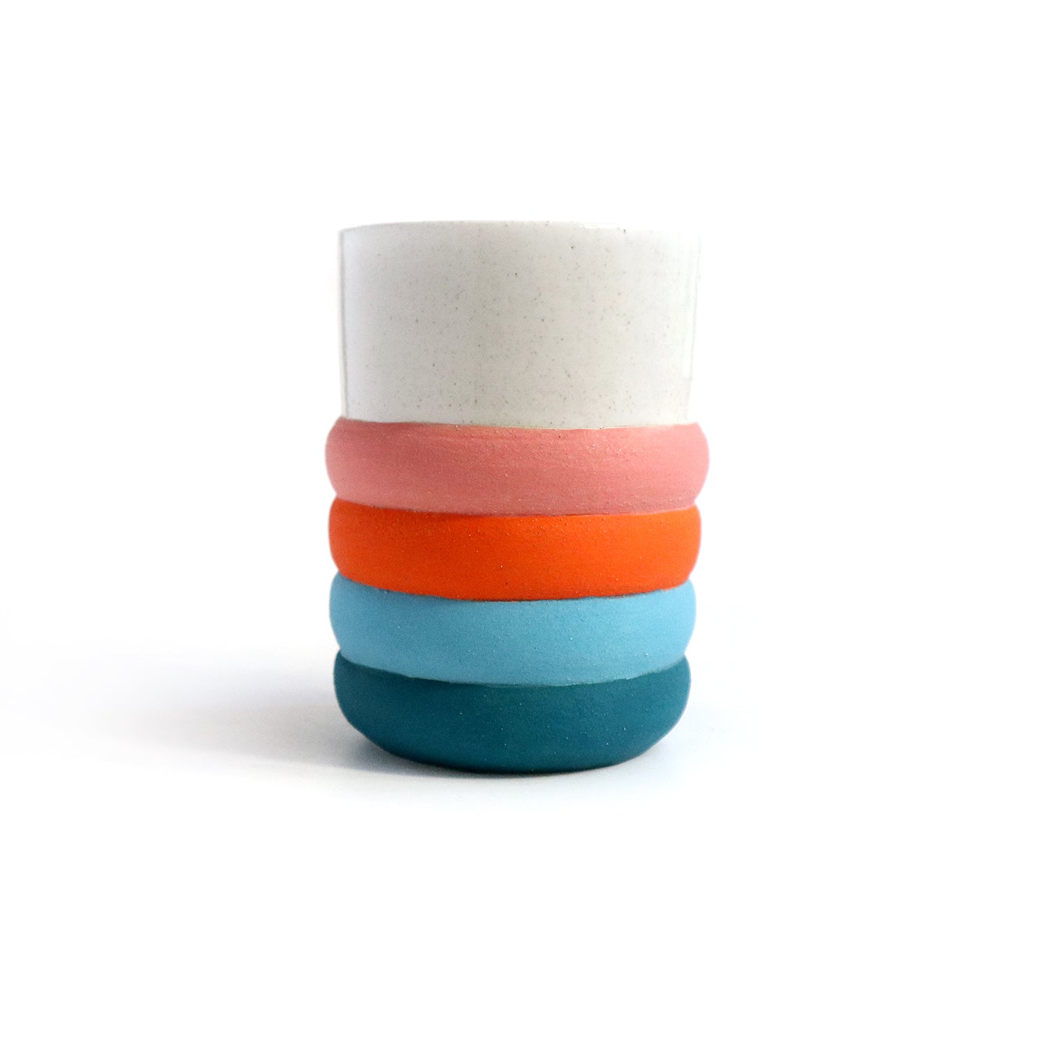 Wheel thrown ceramic tumbler. Measures approx. 4.75" tall with tapered shape. 2.75" wide at bottom of cup and 3.5" wide at lip. Holds approx. 10 oz. Hand painted with under glazes and carved. Glossy white glaze. Speckled clay. Hand washing recommended.