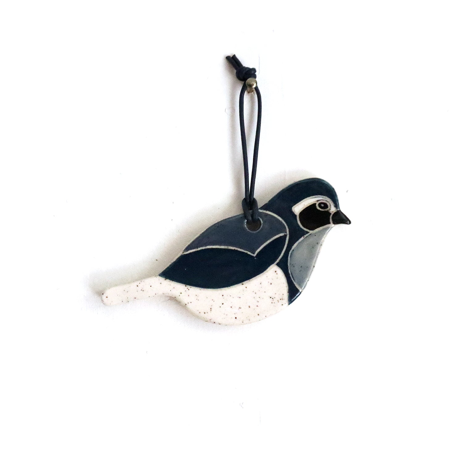 Hand painted with under glazes and carved. Glossy clear. Leather strap. Measures approx. 2.5" tall (4" incl. strap) and 4" wide.