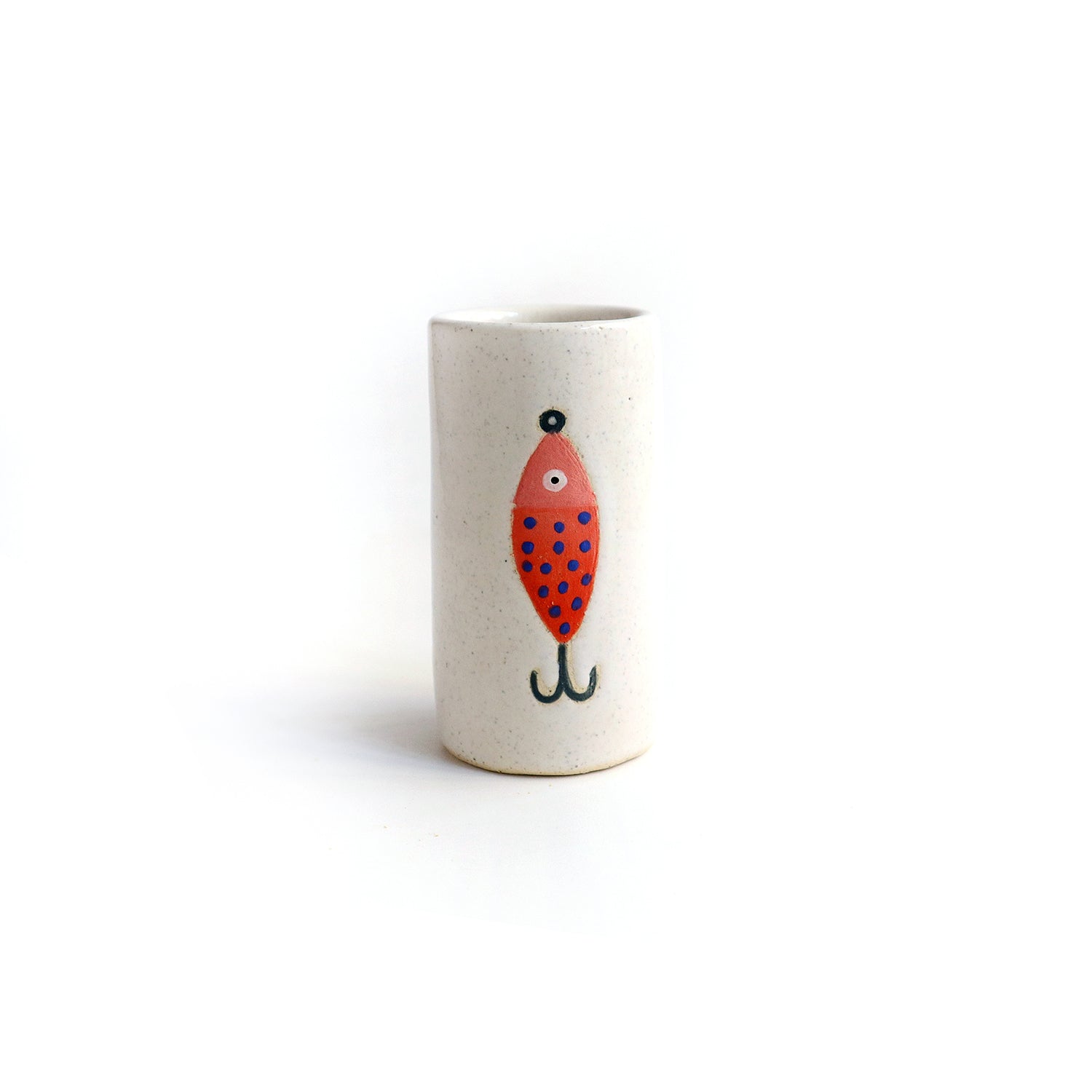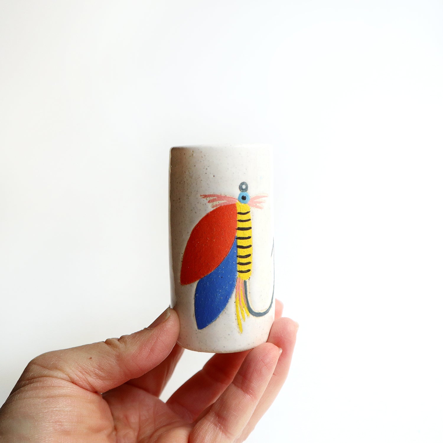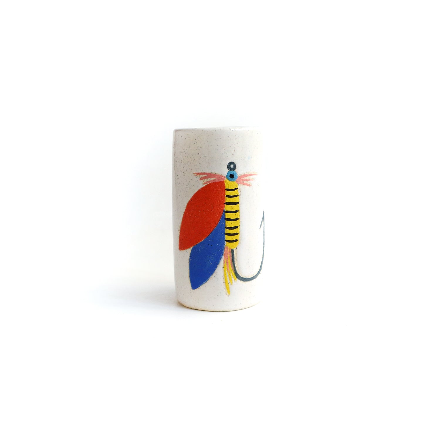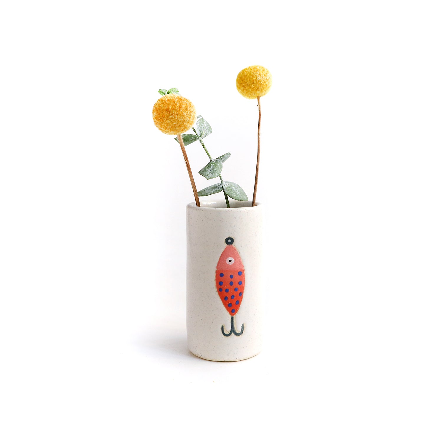 Ceramic bud vase was wheel thrown, painted with under glazes and carved. Glossy white glaze. Measures approximately 3.25" tall and 1.75" wide. Hand washing recommended but can put in dishwasher.