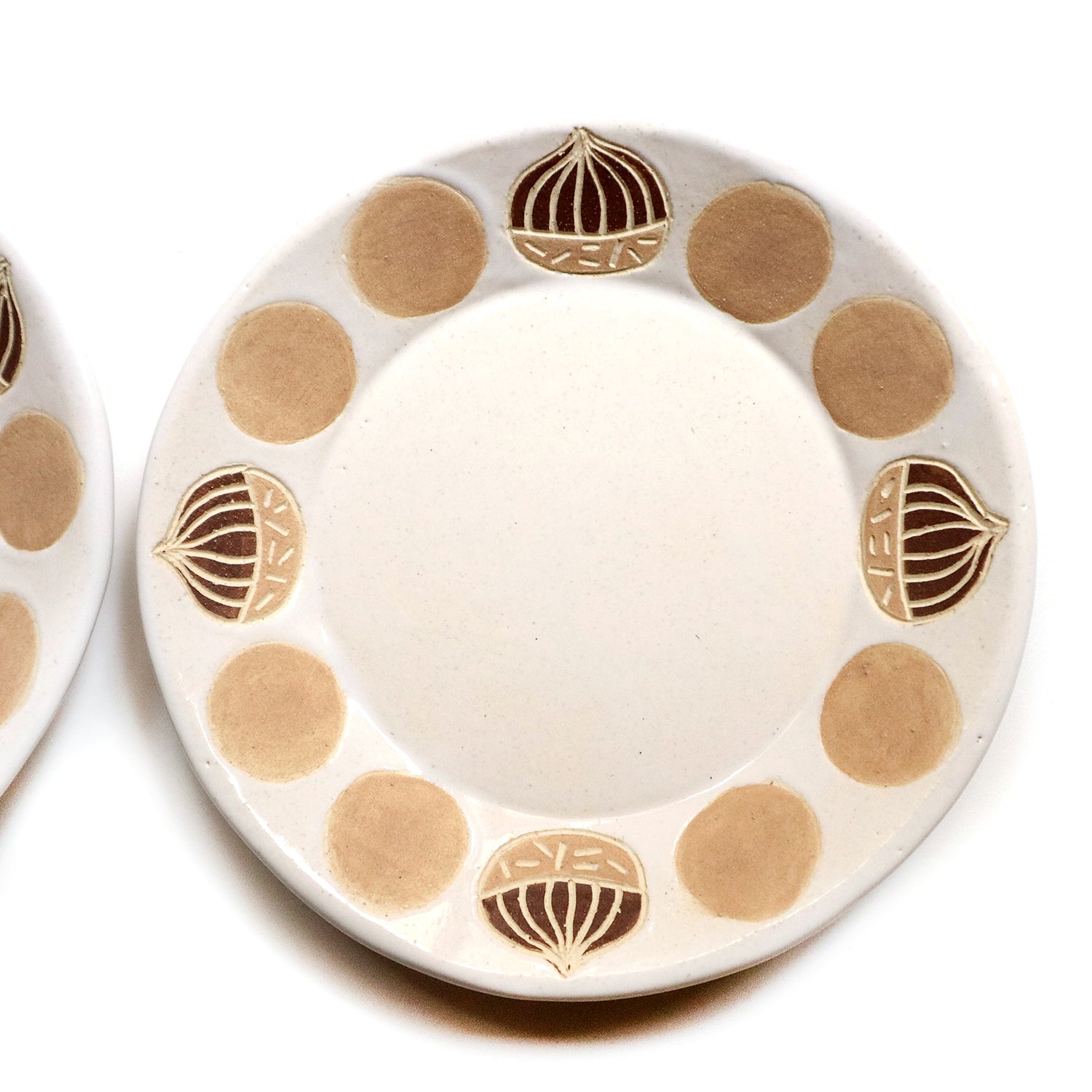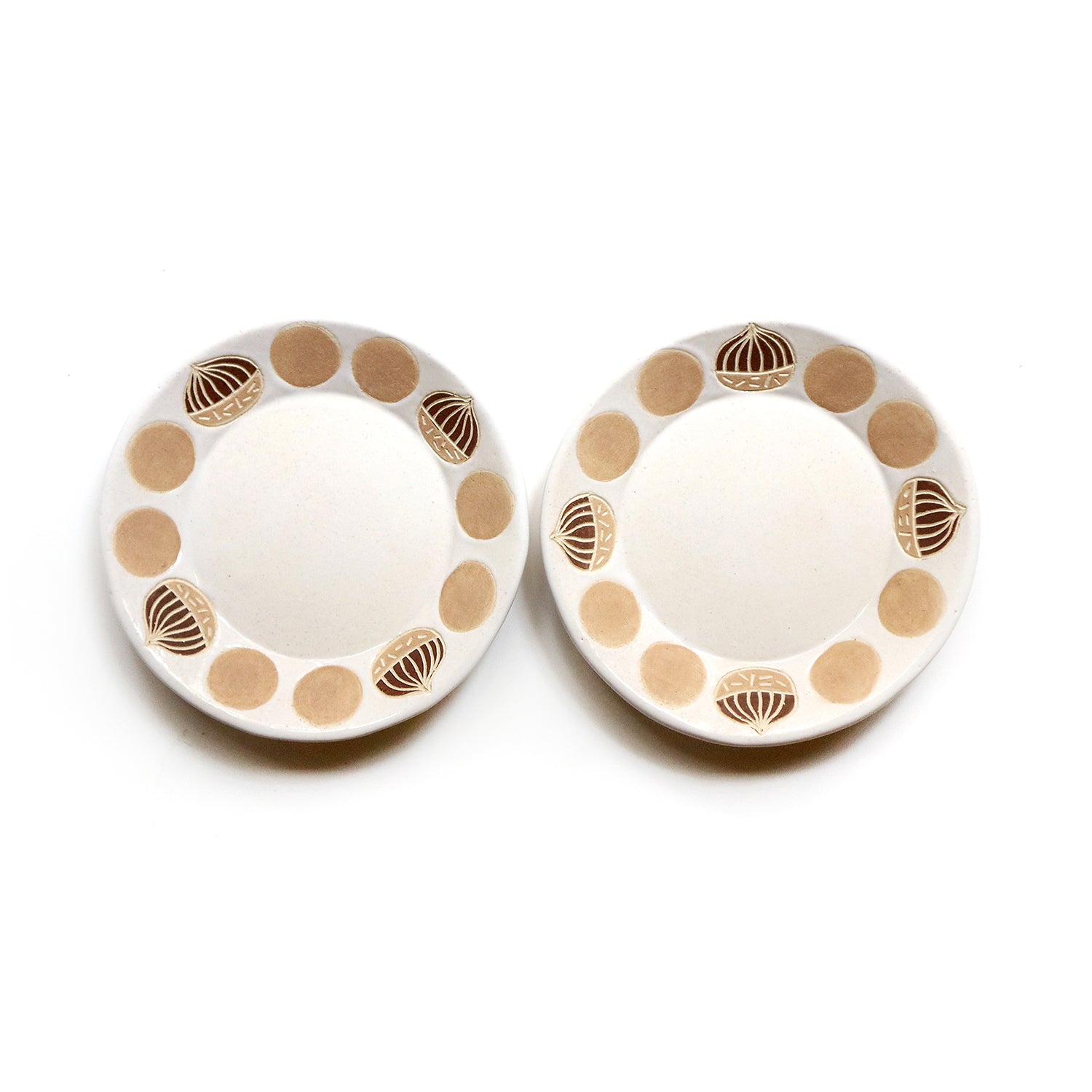 Ceramic dish measures approximately 5" wide and .75" tall. Hand painted with under glazes and carved. Glossy white glaze. Hand washing recommended but can put in dishwasher. Microwave safe. This listing is for one dish.