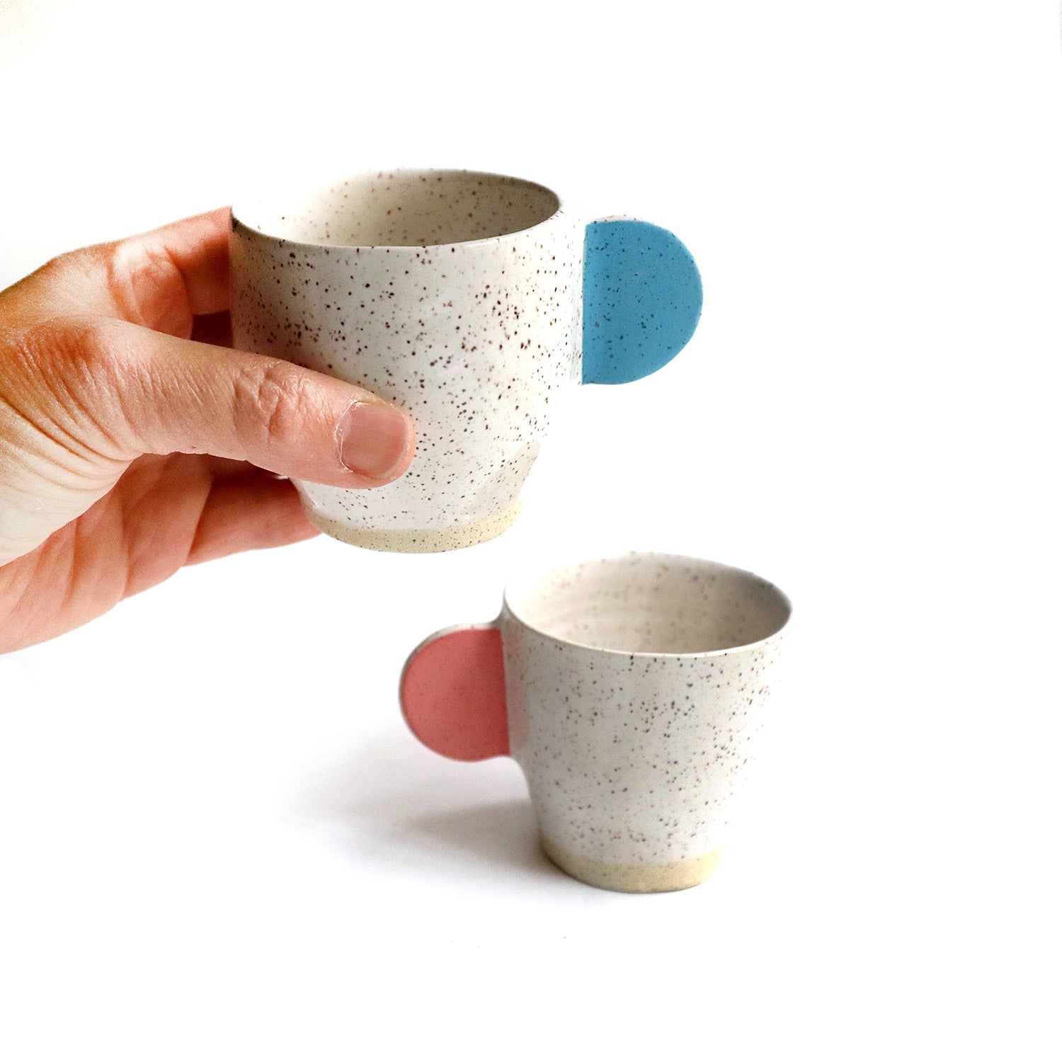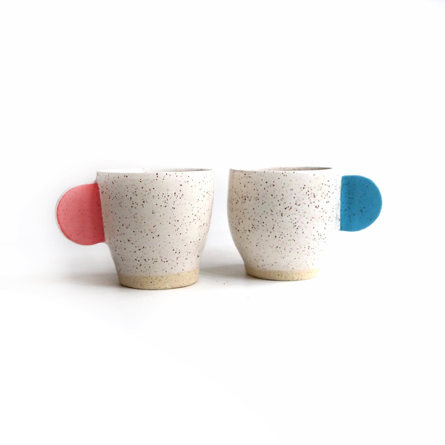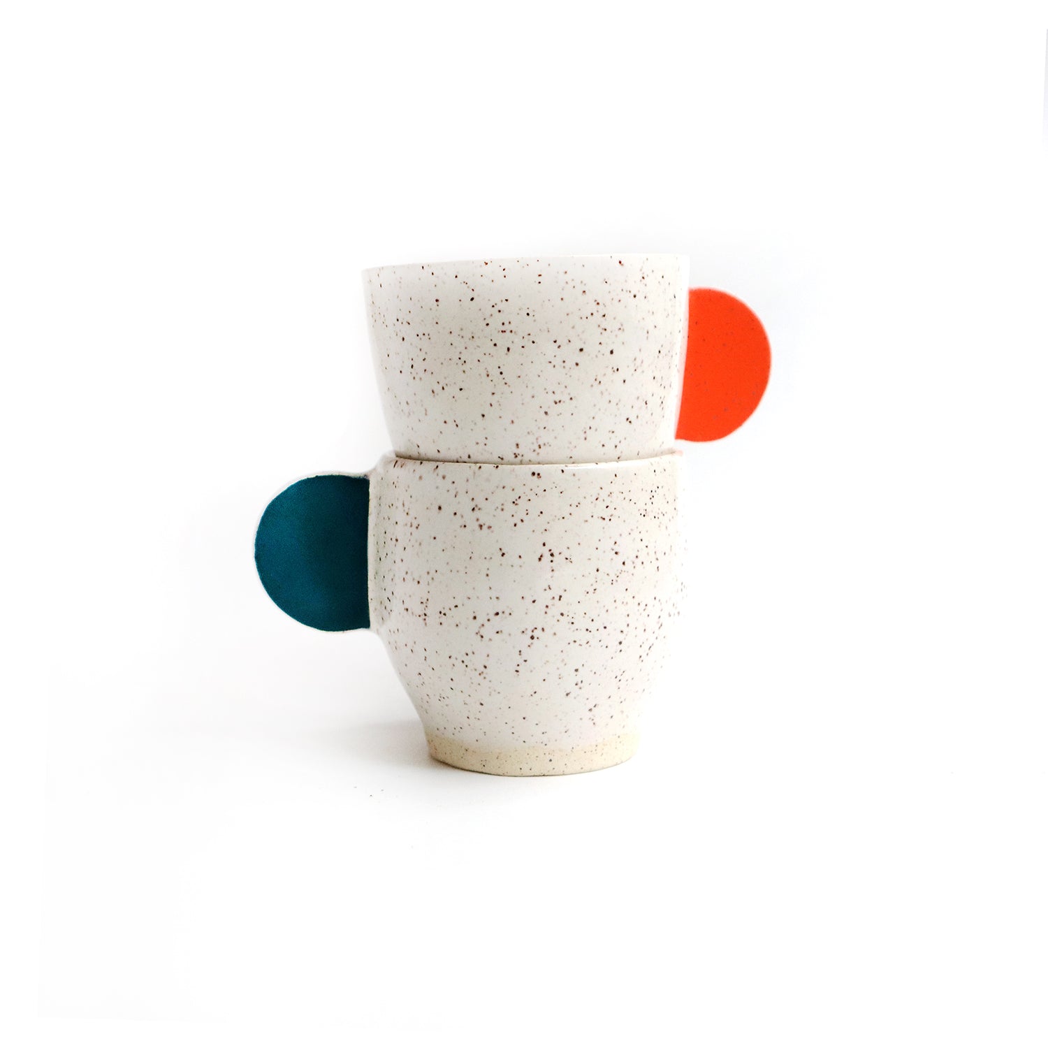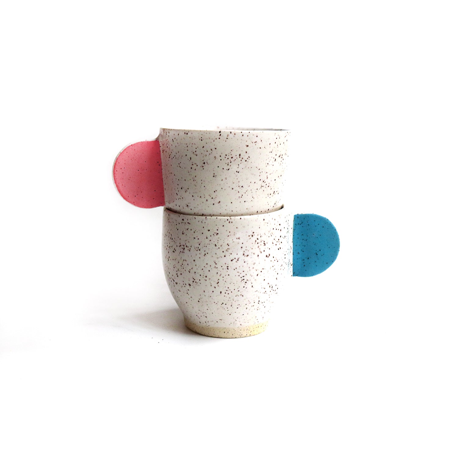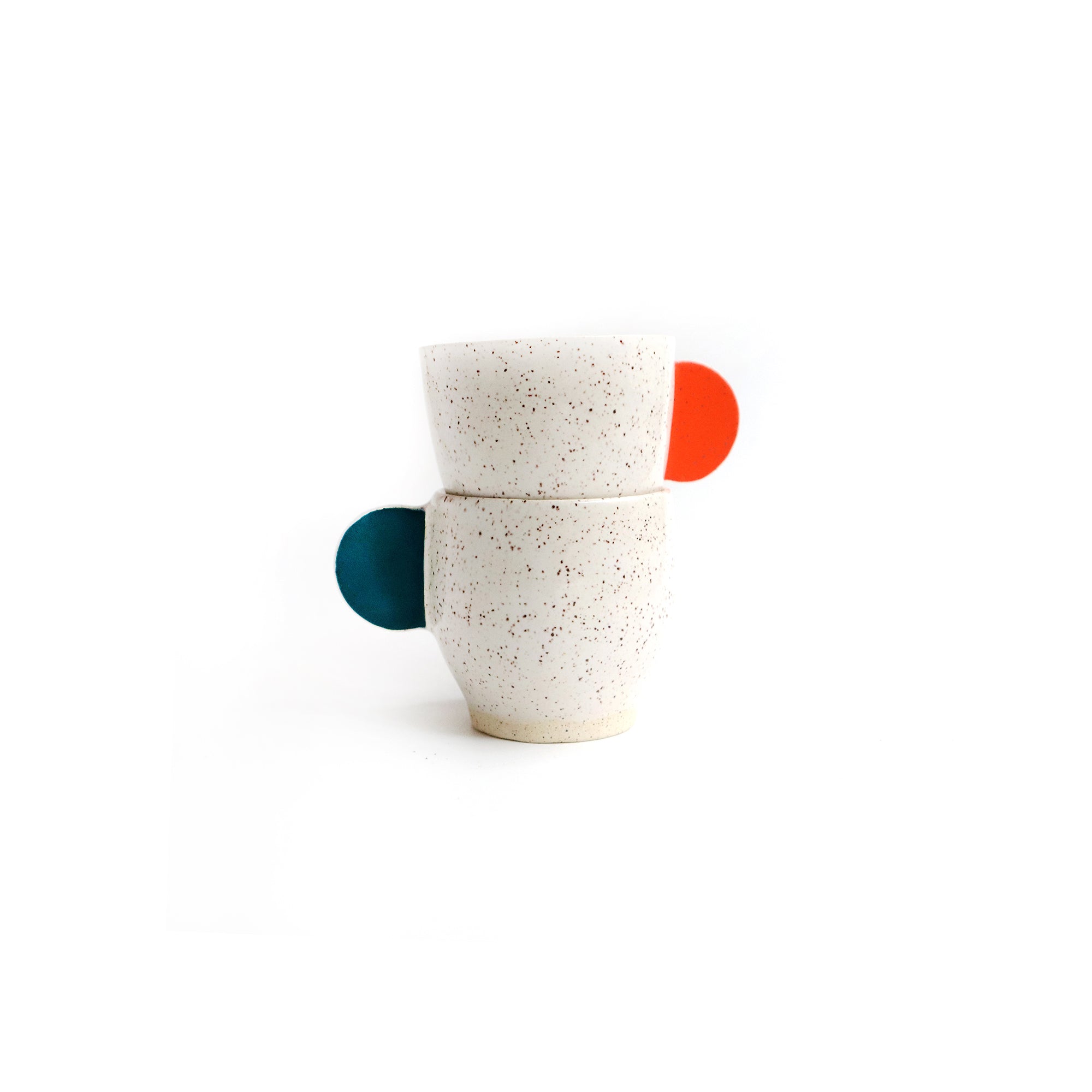 This ceramic espresso set of two cups was wheel thrown. The handles were slab built and painted with an under glaze. The cups are glazed a glossy white finish. Each cup measures approximately 2.75" tall and 2.5" wide. Speckled clay. Hand washing recommended.