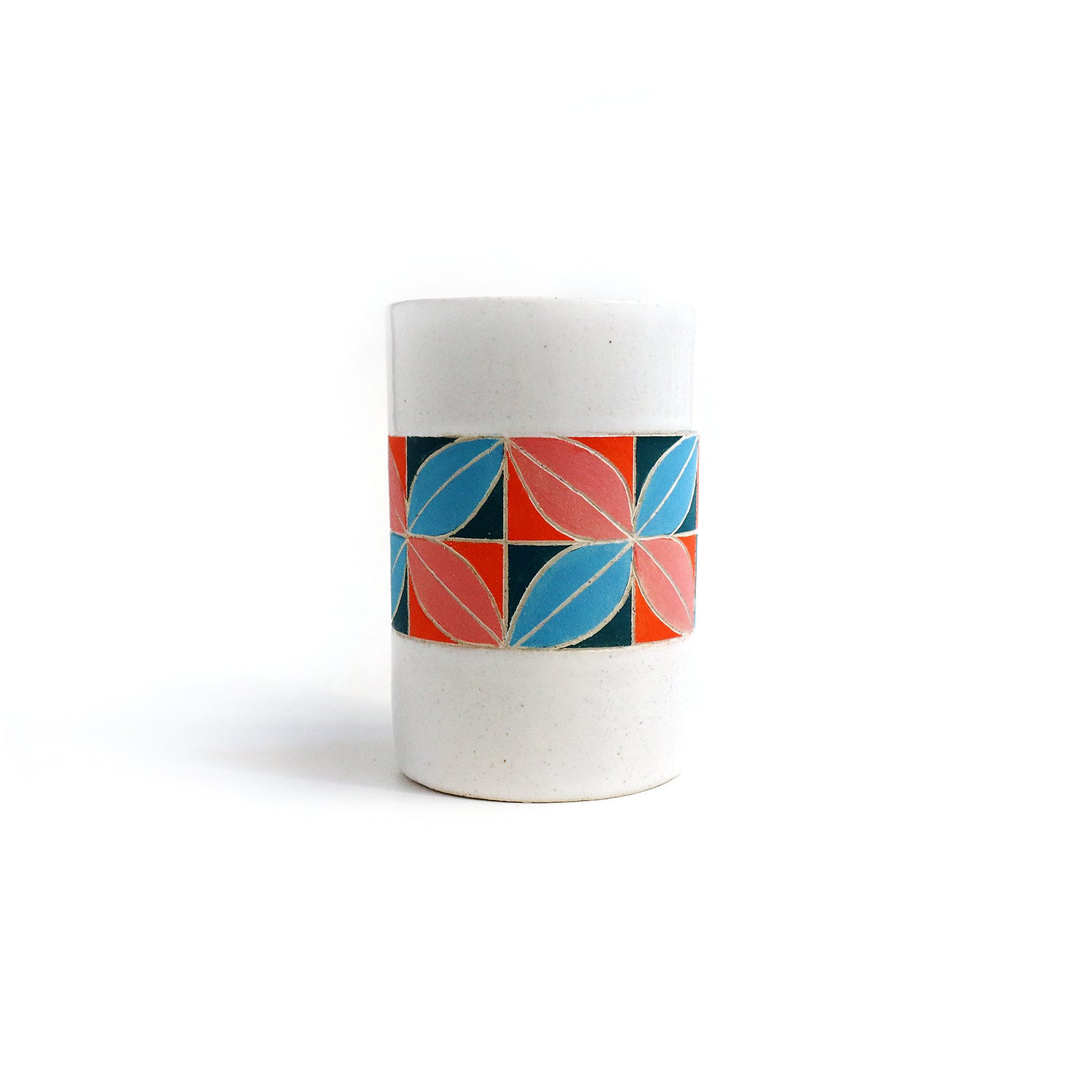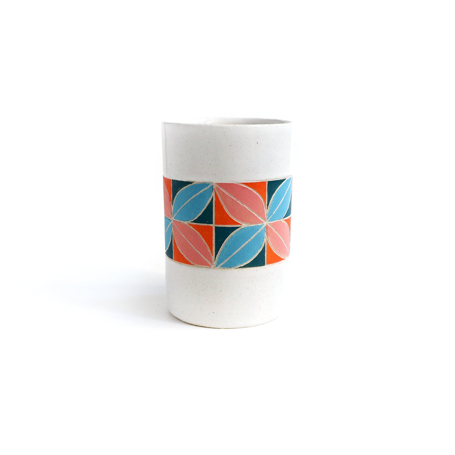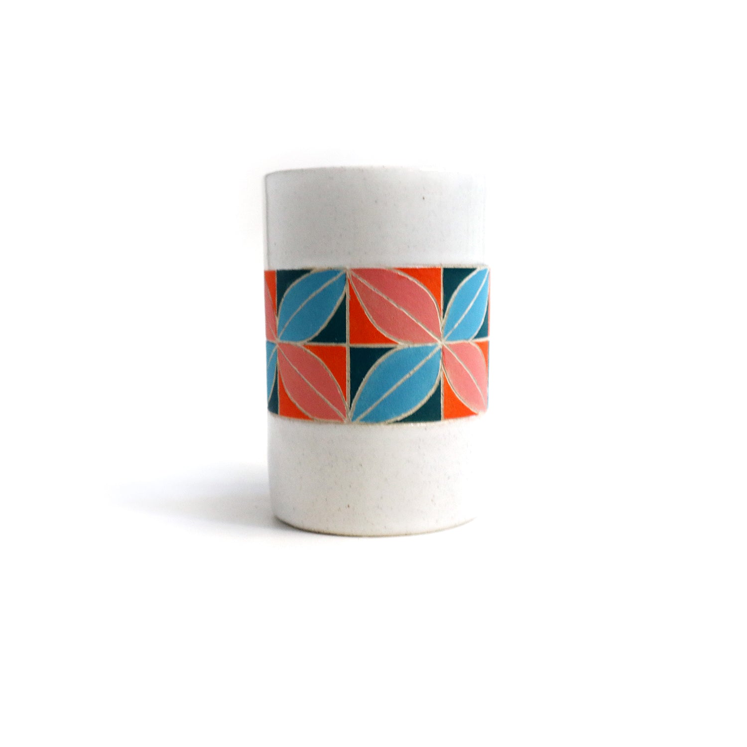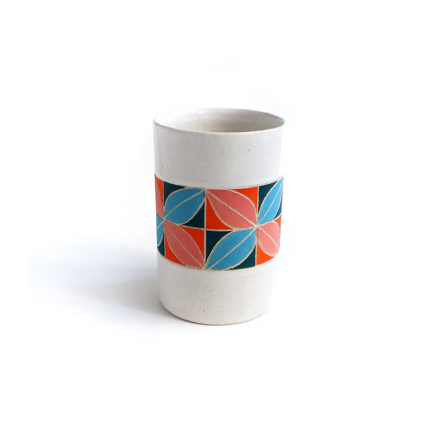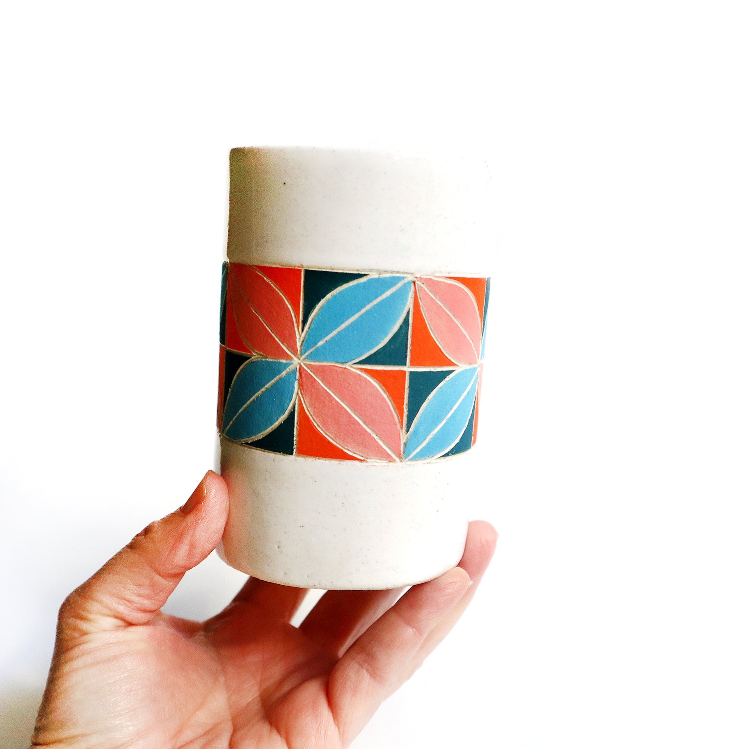 Wheel thrown ceramic tumbler. Measures approx. 4.5" tall and 3" wide. Holds approx. 10 oz. Hand painted with under glazes and carved. Glossy white glaze. Hand washing recommended.