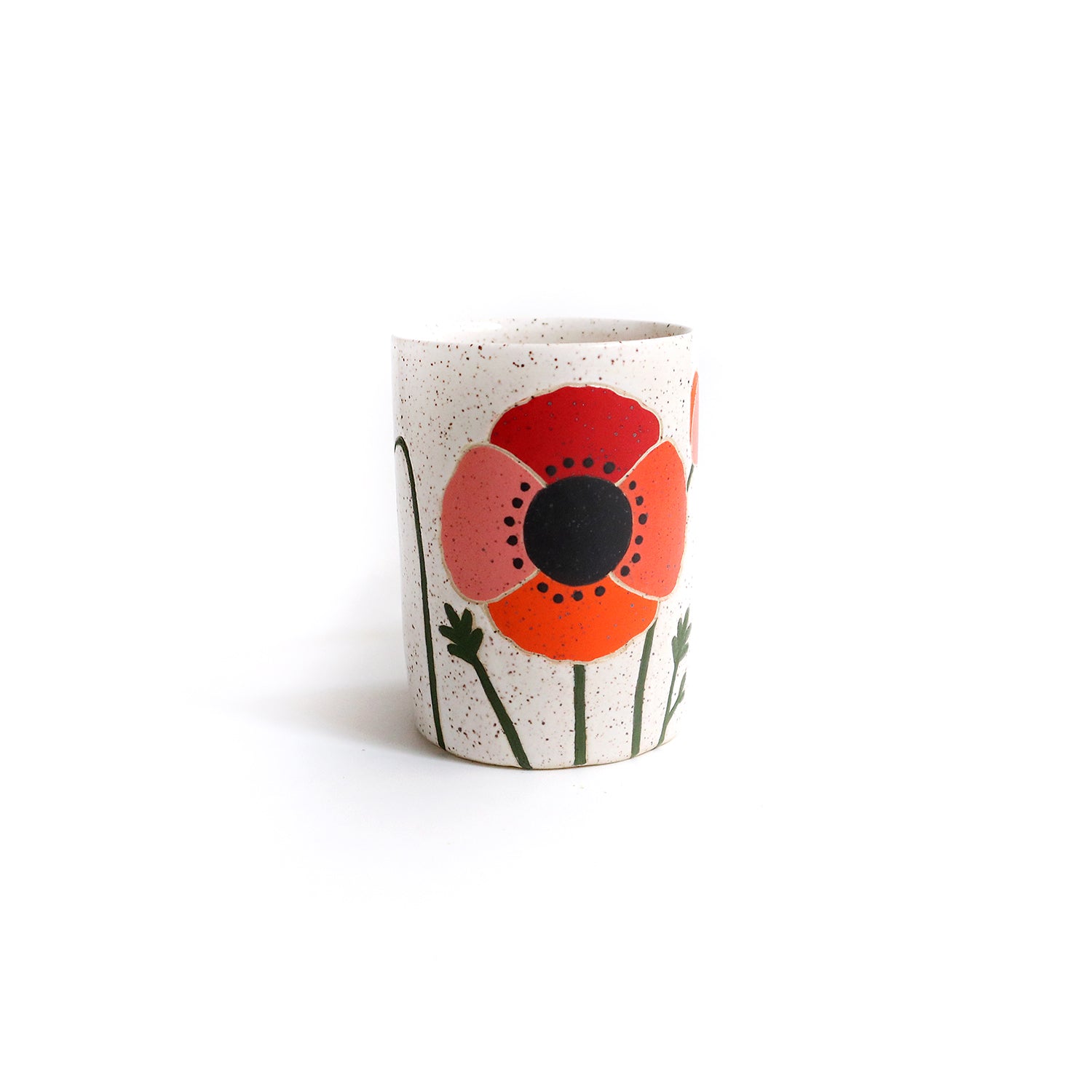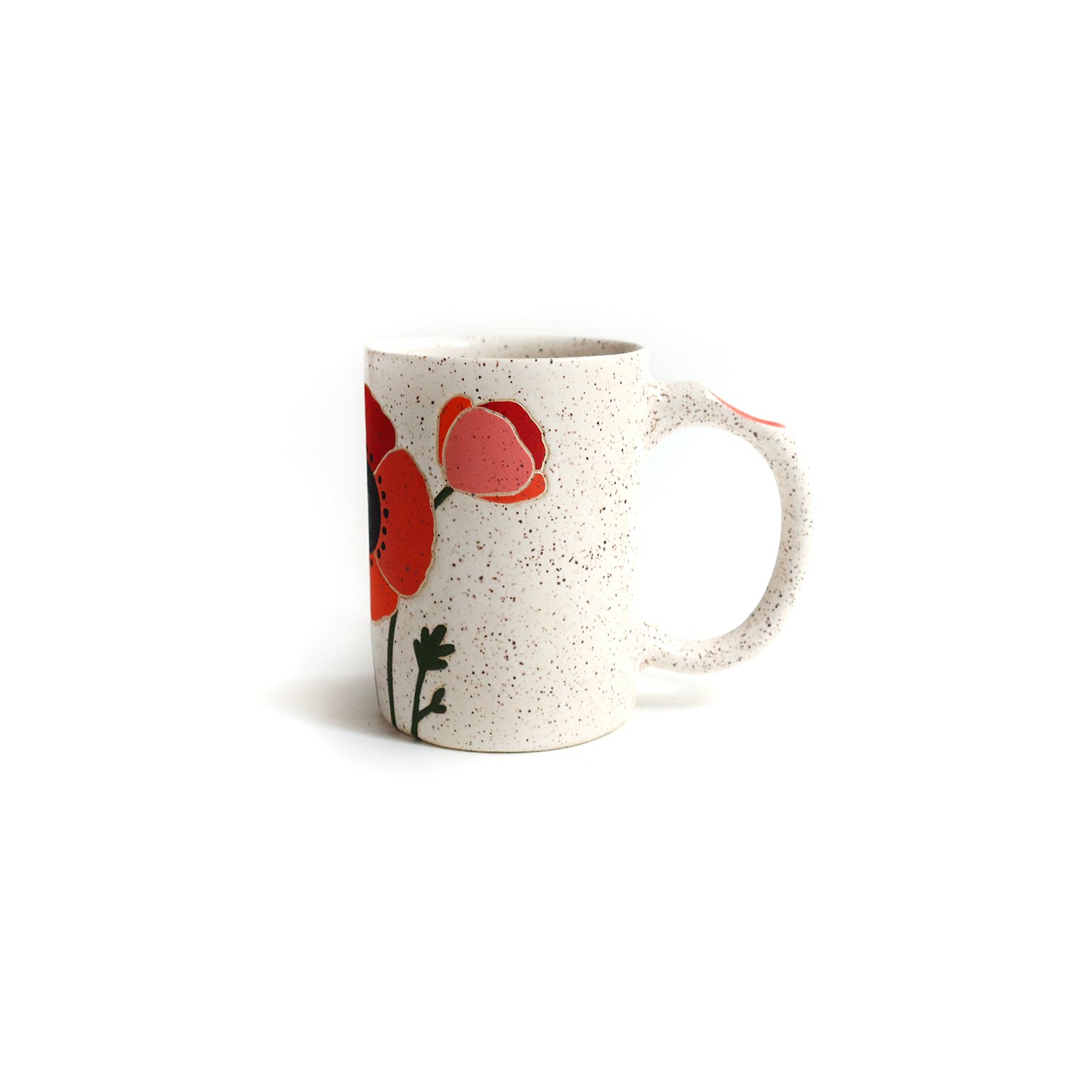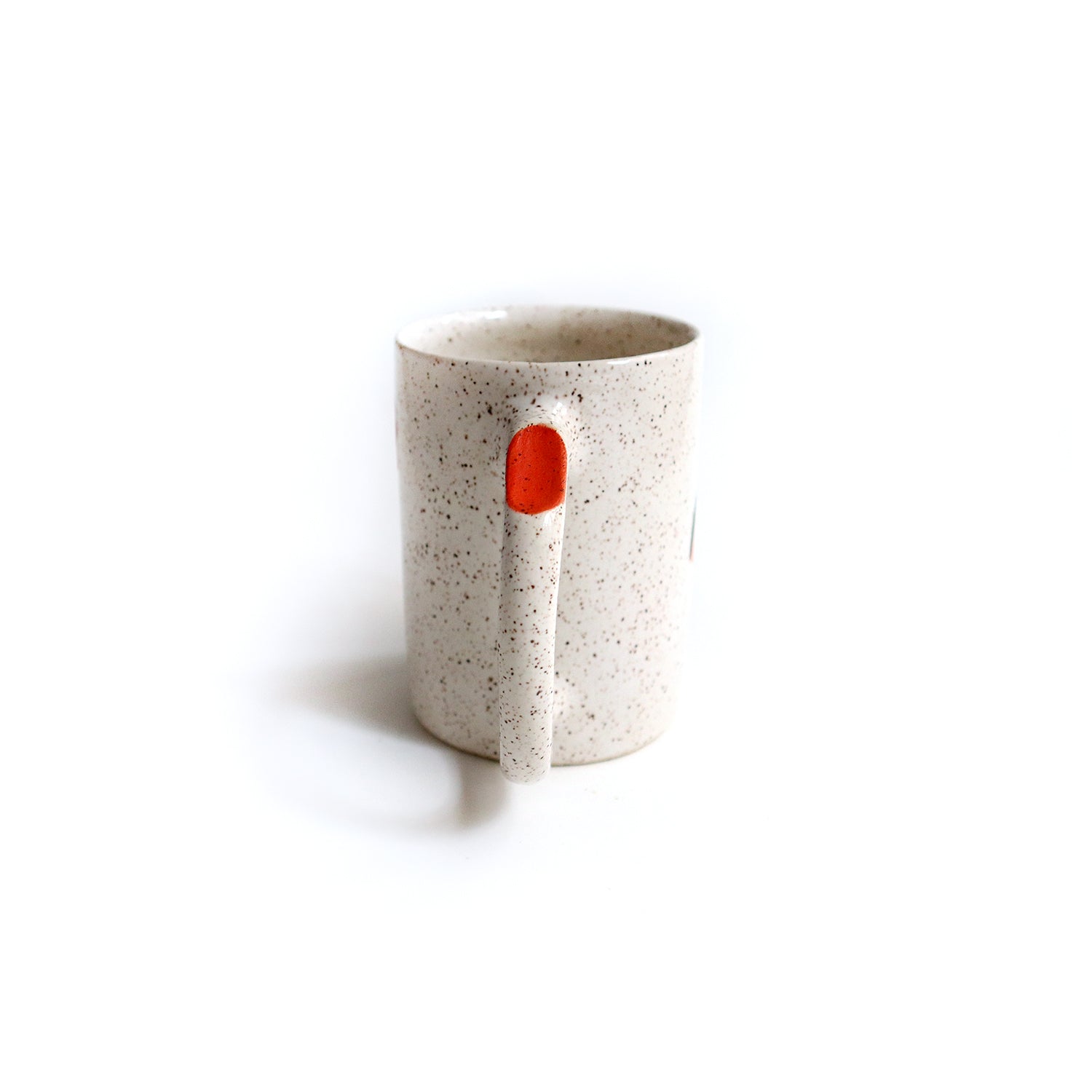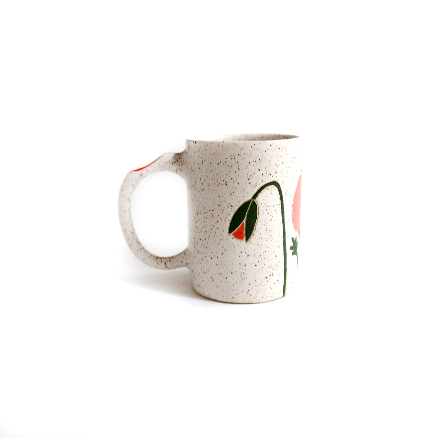 Wheel thrown stoneware mug. Measures approx. 4" tall and 3" wide. Holds approx. 10-11 oz. Glossy white glaze. Hand washing recommended but can go in dishwasher.