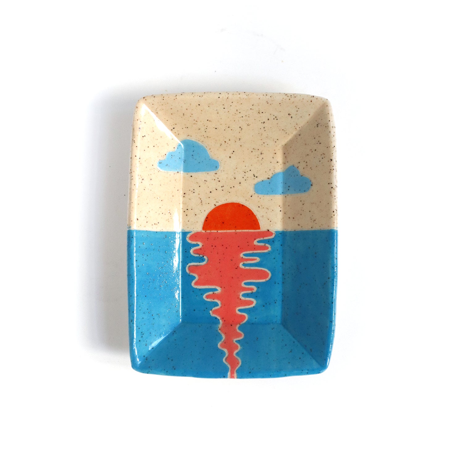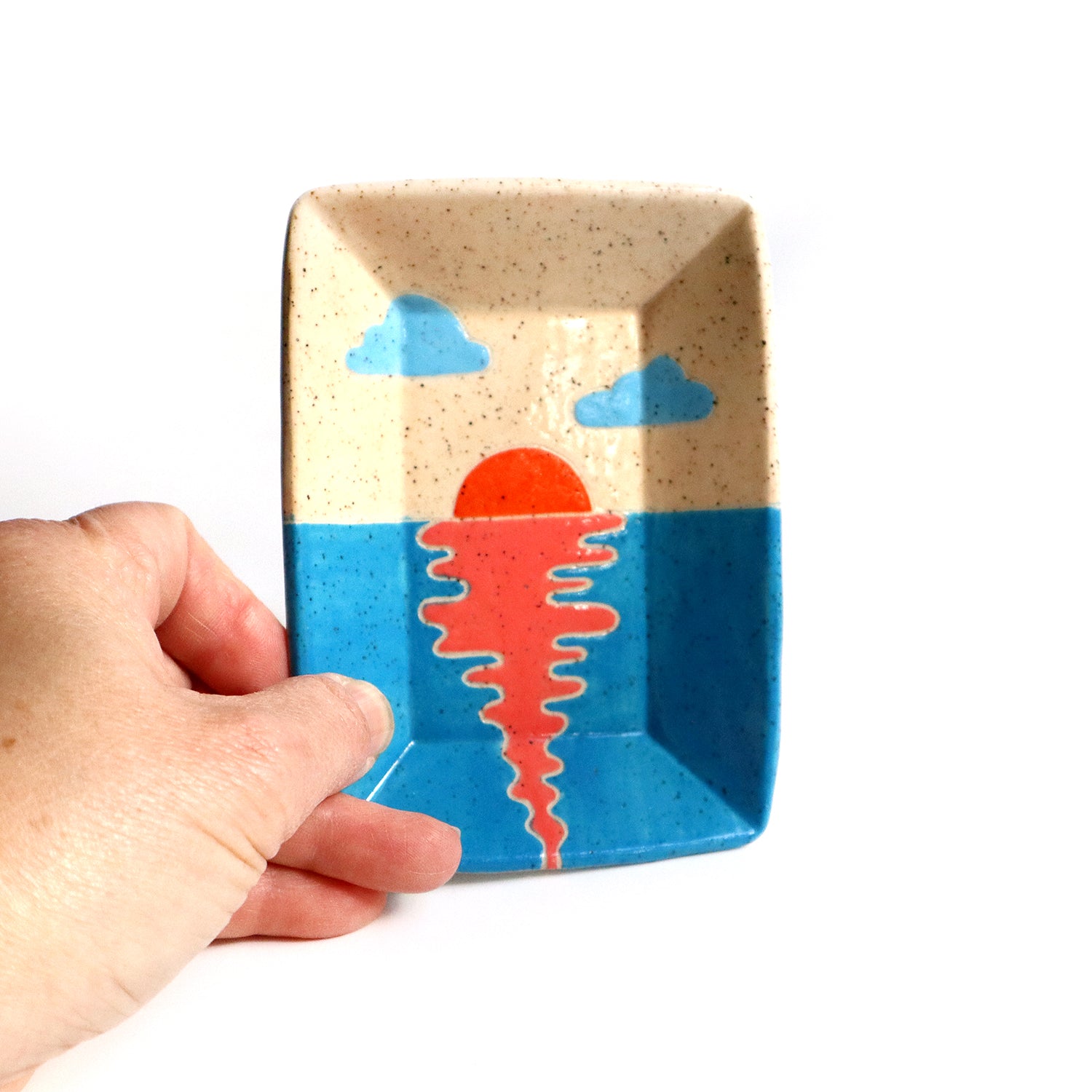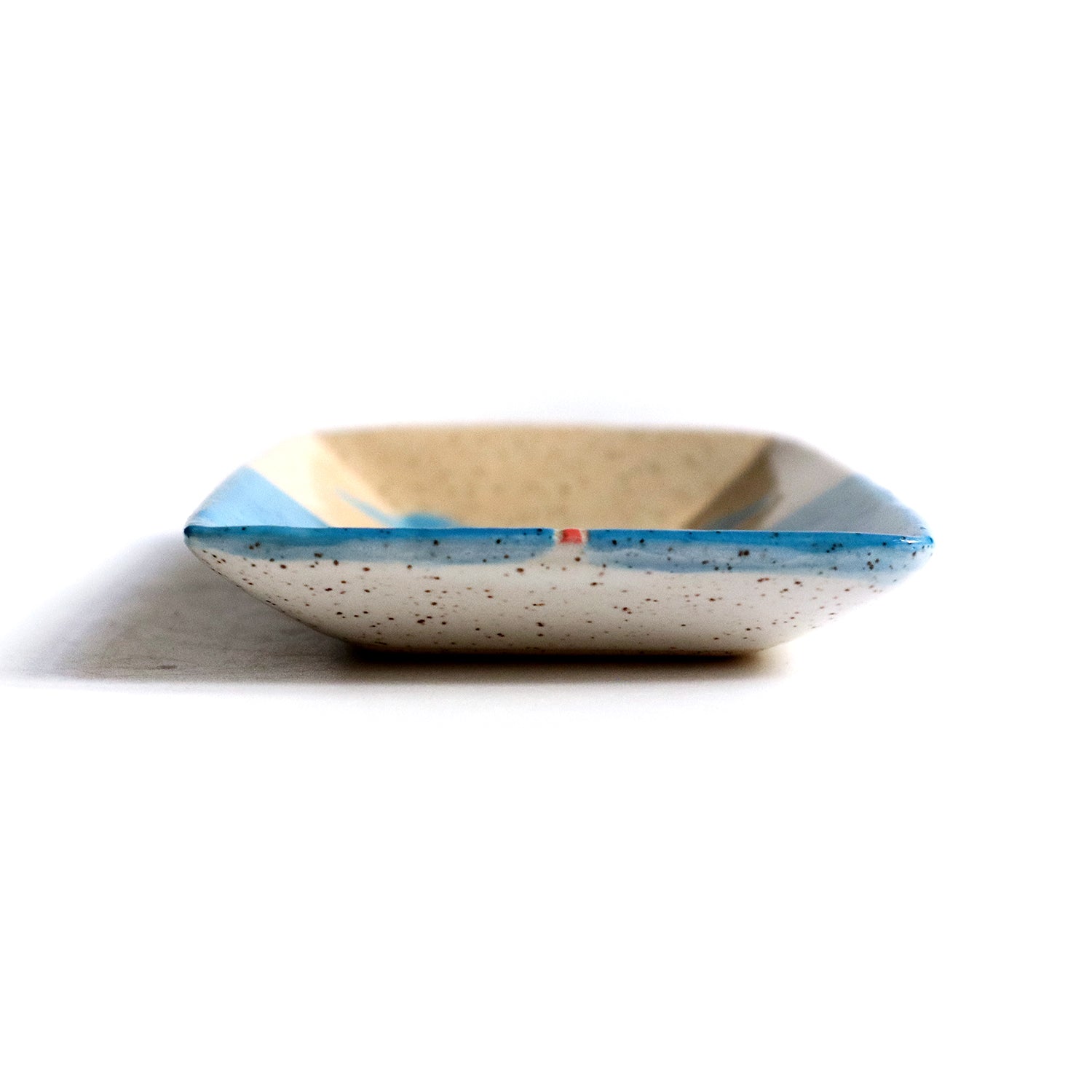 Clear glaze. Hand painted with under glazes and carved. Measures approx. .75"T and 4.75"L and 3.5"W.