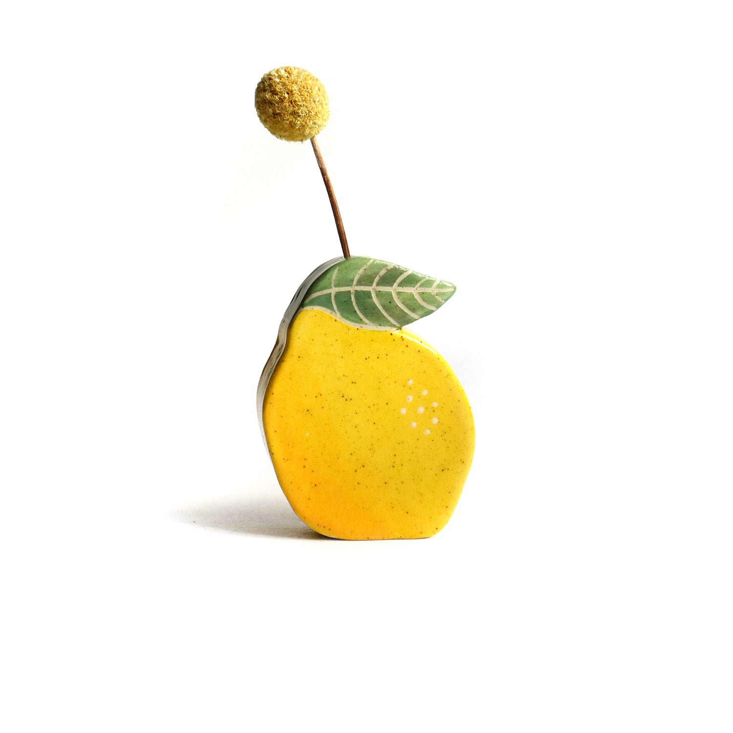 Teeny tiny ceramic bud vase. Measures approx. .6" deep and 2.75" tall and 2.25" wide. Hand painted under glaze and carved. Clear glaze. Hand washing recommended.