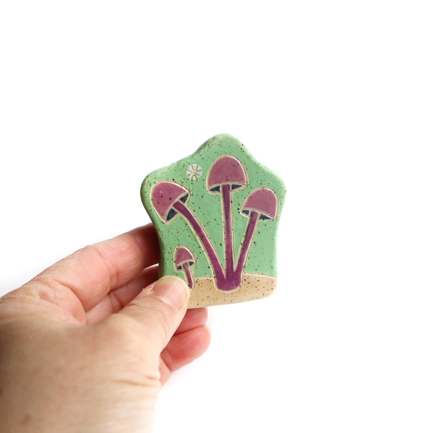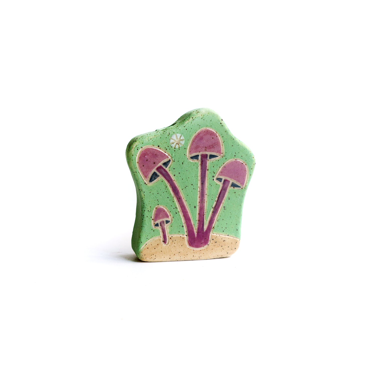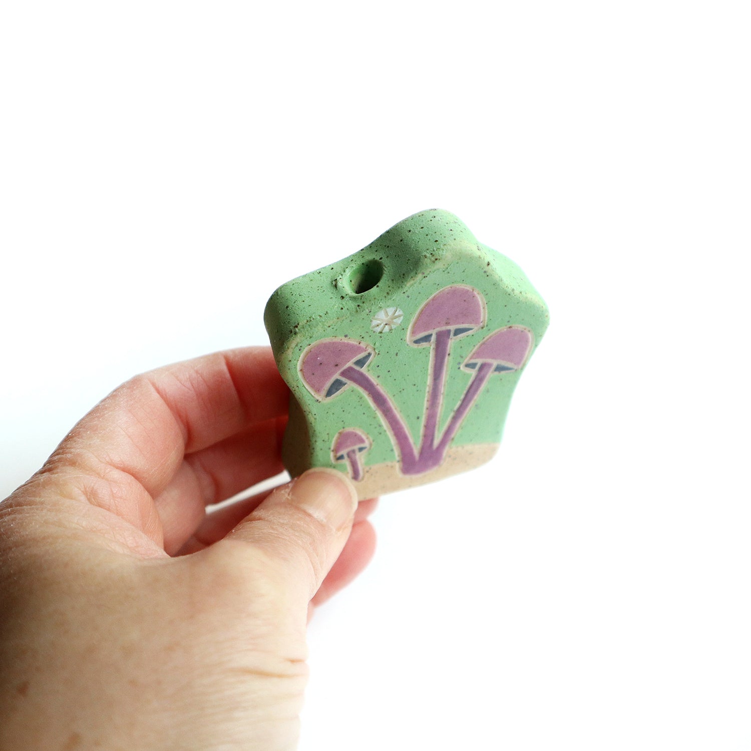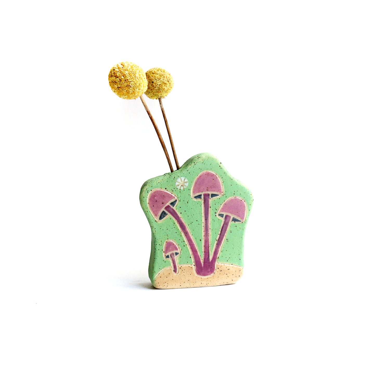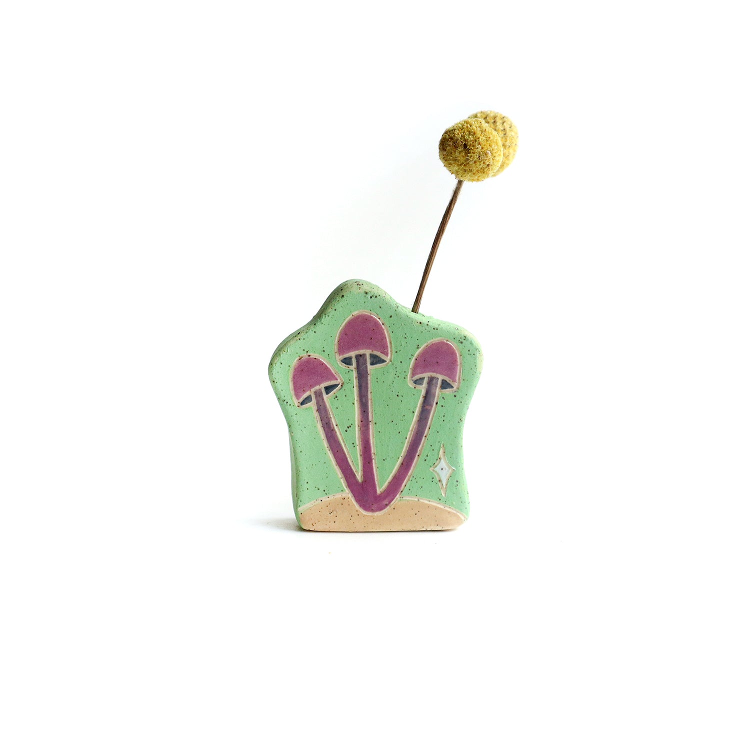 Teeny tiny ceramic bud vase. Measures approx. .6" deep and 2.6" tall and 2.25" wide. Hand painted under glaze and carved. Hand washing recommended.